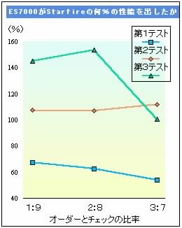 グラフは、ベンチマークにおいてES7000がスターファイアーの何%の性能を発揮したかを示したもので、買い注文を中心にしたオーダー処理と発注状況確認を中心にしたチェック処理の合計で性能を計った。1回のテストに当たり、オーダー処理とチェック処理の比率を3段階に変えて測定したが、オーダー処理の比率が高いほどシステムにかかる付加が大きくなる。2対8の比率が実際の業務に最も近いという。