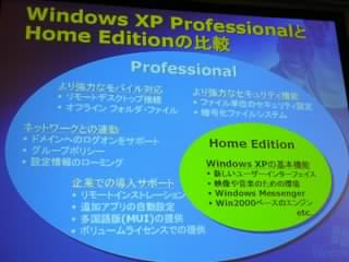同社ではWindows XPをブロードバンド時代のウィンドウズと位置づけており、Windows2000をベースにした完全32ビットのエンジンを備えている。新しいユーザーインターフェースと映像や音楽を楽しむための基本機能を搭載した「ホームエディション」に対し、「プロフェッショナル」は強固なセキュリティ、強力なモバイル機能、ネットワークとの連動など、企業ユースでのさまざまな機能を盛り込んでいる。
