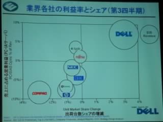 「売り上げが伸びているだけでなく、利益が拡大していることがポイントだ。市場シェアの伸びと利益の伸びをグラフにしてみると、他のパソコンメーカーと比べてデルが著しく優れていることが明白になる」とロリンズ社長。インターネットを活用して、顧客や社員、取引先と良い関係を築いていることが不況下でも成長できる理由だとした。徹底的なサプライチェーン管理により、取引先の部品メーカーの生産体制とデルの生産体制が効率よく結びついており、部品在庫が4日分という圧倒的な低コスト構造を実現している。