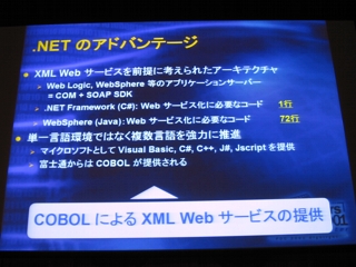 記者会見の後に開催された「ドットネット・デベロッパーズコンファレンス」では、IBMやサン・マイクロシステムズ、オラクルなどの他社が提示しているウェブサービス体系との比較が取り上げられ、阿多親市社長は「マイクロソフトはウェブサービスを構成する全部の要素を提供できるだけでなく、開発環境も優れている。ウェブサービス化を果たすために、ドットネット・フレームワークなら1行を加えればすむところが、Javaで書くと72行もかかる。また、複数の開発言語をサポートでき、とくに稼働中の業務ソフトの70%を占めるといわれるCOBOLを利用することが可能。COBOLのエンジニアは300万人もいる。さらに、携帯端末からパソコンまで、同じプログラミングモデル、同じ開発環境が利用できるのもドットネットだけだ」と述べた。次いで、パフォーマンスのスケーラビリティの高さを示した。サン自身のベンチマークコードを使って、Javaを大幅に上回る性能を叩き出したという。多数のユーザーをサポートできるスケーラビリティの高さが証明されたとした。