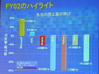 会見の冒頭で、コナーズCFOは米国のIT産業の近況について触れ、「経済環境などでどうしようもない時期も確かにあるが、どんな時でも当社は少なくとも競合他社よりも良い業績をあげることを目標にしている。2002年度でこれまでのところ当社以外に売り上げを伸ばしているのはAOLだけだ」と写真(FY02のハイライト、各社の売上高の伸び)を示した。また、「全米の株式時価総額はバブル崩壊前の2000年7月時点ではトップ10のうちの6社をIT産業が占めていたが、今年の4月現在ではトップ10に残っているのは当社とインテルだけだ。この間に、当社の株式時価総額も3,760億ドルから3,100億ドルに減じたが、他社の下がり方はもっと激烈で半減以上である。このため、当社のランキングは以前の4位から現在ではGEに次ぐ2位へと上昇している。これらすべては、当社が常に長期的な視点で戦略を立て、経営を行ってきた成果だと思う」と述べた。