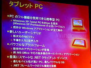 タブレットPCはマイクロソフトが発案したもので、必要なハードウエア要件なども同社が規定している。基本的にはノートパソコンの進化形態だと位置づけており、ハイエンドのノートパソコンの機能をすべて備えたうえで、タブレットPCとしての特有の機能を追加している。