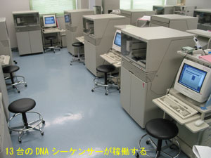 5階は遺伝子クローニングと塩基配列の解析のためのフロアで、ABI-PRISM3700などのオートシーケンサーが13台稼働している。民間の施設では国内第2位の規模の解析センターだという。ショットガン法やプライマーウォーキング法などを利用し、1日に350万塩基対の大量解析能力がある。