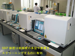 4階は遺伝子多型解析とDNAチップ/マイクロアレイによる発現解析を行う設備が並んでいる。電気泳動をベースにした高精度SSCP(Single Strand Conformation Polymorphism)装置(日立電子エンジニアリングから製品化されている)が11台、質量分析を利用した高速多型解析用のマスアレイ装置が1台導入されている。これは、米シーケノム社からの技術導入で作製した装置で、大規模なSNPタイピングが可能。