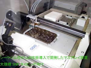 また、DNAチップ/マイクロアレイに関しては、設計用のソフトも自社開発しており、チップ製作から解析までを一貫して行える体制を敷いている。スポッターは日立ソフトウェアエンジニアリング製だが、最近ではオリゴチップへの対応も行っており、こちらは設計だけを内部で行い、製作は外注となっている。
