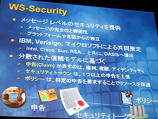 「また、今年の4月にIBMやベリサインと共同でウェブサービスの新たなセキュリティ技術を開発した。プラットホームや言語から独立した基盤技術で、マイクロソフトが独自に実装したものを“トラストブリッジ”と呼んでいる。トラストブリッジはネットワークの境界に配置され、認証と承認を通して組織を超えたセキュリティの共有を可能とする。ケルベロスなどのセキュリティフォーマットを利用して、アクティブディレクトリーやドットネットパスポートにセキュアにアクセスできる。これにより、互いの信頼関係が接続され、相互の協調が可能になる」と解説した。