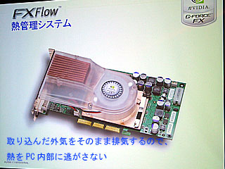 一方で、熱対策や静音化対策でも新技術を導入した。熱対策は“FXFlow”熱管理システムと呼ばれ、外気を吸気し、そのまま外へ排気する仕組み。この場合、カードから発生した熱がパソコン内部に逃げることはなくなるが、拡張スロット2枚分のスペースが必要になる。実際のインプリメンテーションは、チップを採用してカードを開発するメーカーに任されるようだ。