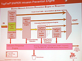 これらの攻撃を的確に見分けるのが独自の“TopFire”技術で、具体的なイメージは写真の通り。全体で4段階の防御メカニズムを持っており、まず第1段階では典型的な攻撃パターンのシグネチャーとのマッチングを行う。これは最近の一般的な侵入検知システム(IDS)と同じだという。 Attack Mitigator IPSではこのあとにさらにDoS/DDoS攻撃専用のフィルタリングエンジンを置いている。第3段階はワーム攻撃を防御するための専用エンジン、最終の第4段階では異常なトラフィックを検出するエンジンを備えている。これらの防御メカニズムはすべて専用のASIC上で動作するため、パケットが通過する際の遅延はわずか20マイクロ秒。インラインのセキュリティソリューションとして十分な性能を発揮する。