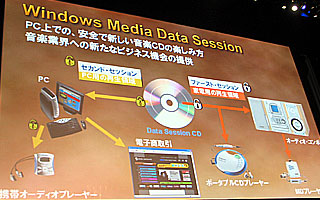 デジタル著作権管理も柔軟に設定可能で、古川副社長は「著作権を守るために闇雲にコピーを禁止する時代は終わった。著作権者が自由に条件を設定・開示して、利用者との間でクリアな関係を結ぶことができる」と強調した。そのために有用なのが“Windows Media Data Session”と呼ばれる技術(写真参照)で、一般のCDプレーヤーなどで再生できる領域とパソコン用の再生領域を切り分けておき、デジタルメディアとしての複製に関して自由な条件を定めておくことができる。マイクロソフトが合わせて発表した“HighMAT”(ハイマット)技術を使えば、音声・画像とプログラムを連動させてディスクを構成することができるため、「プログラム次第でいろいろなことができる。例えばコピーしたコンテンツが1ヵ月で期限切れになり、それ以上楽しむ時にはオリジナルディスクを要求するということも可能。これなら3日後には中古屋に売り飛ばされて制作者が複雑な思いをするということもなくなるのではないか。そのように、きちんと条件を示してデジタルメディアを有効に活用してもらうことは、制作者・消費者の双方の利益にもなり、その中から新しいビジネスモデルが生まれてくる可能性が広がる」と述べた。