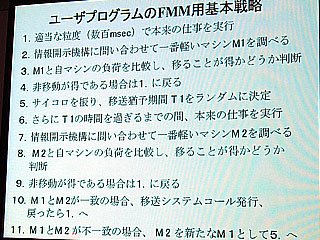 また、マシン間の負荷分散は、“自由市場原理に基づくスケジューリング方式”(FMM方式)を開発して盛り込んだ。“情報開示機構”と呼ばれる機能が各ノードの動作状態を監視しており、アプリケーションがタスクを並列化するリクエストを出すと、情報開示機構がその時点で一番リソースが空いているマシンを提示してくれる。ランダムな時間間隔でマシンの照会とタスク分散を繰り返すことにより、複数の並列アプリケーションを同時並行的に効率良く動かすことができる。(右の写真参照)