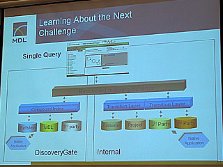 次に紹介されたのが「ディスカバリーゲート」。通常は探したいDBを指定して、その専用クライアントから検索などをかける必要があったが、ディスカバリーゲートでは1回のログオンと1回の検索で多数のDBを横断的に検索することができる。MDL向けの17種類のDBに加えて、ISI/ダウエント/カレントドラッグスなどのサードパーティーコンテンツにも一元的にアクセスできることが特徴。検索可能な情報量は、1,200万種類以上の化合物情報、2億5,000万件以上の関連情報におよぶ。