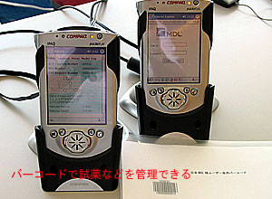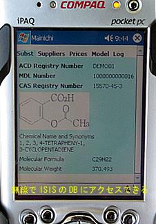 今回、両社が共同で開発したプロトタイプは、Windows系のPocketPCに対応したもの。化学薬品の登録ナンバーを示したバーコードを読み取って、無線でISISのデータベース(DB)内を検索し、その化学構造式などの情報をPDA画面上に表示するデモンストレーションを行った。DB内のデータを照会して閲覧するだけでなく、PDA側からデータ入力・更新を行うこともできる。