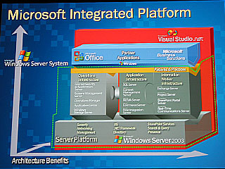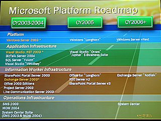 これは、Windowsサーバー2003を全体の基盤とし、その上に“インフォメーションワーカーのインフラストラクチャー”と“アプリケーションのインフラストラクチャー”、“オペレーションのインフラストラクチャー”の3つが乗り、さらにその上にオフィスソフトや各種アプリケーション群が位置し、そのすべての開発環境としてビジュアルスタジオ・ドットネットが働く−という全体像を描く。(写真参照)