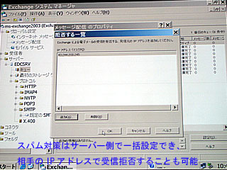 エクスチェンジサーバー2003のデモンストレーションでは、スパム対策機能が紹介された。クライアントのアウトルック2003上で迷惑メール設定を一つひとつ行うこともできるが、今回はサーバー側で管理者が一括してスパム対策を施すことが可能になった。スパム発信者のメールアドレスを指定することに加え、それが送られてくるSMTPサーバーのIPアドレスで受信を拒否することも可能。さらに、リアルタイムブラックリストのサービスを利用してスパムメールをフィルタリングすることも可能。