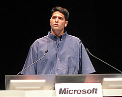 そして、今回の基調講演のハイライトは、インフォメーションワーカーインフラストラクチャーのための重要な構成要素であるエクスチェンジサーバー2003の発表となる。マイヤーソン氏自身はこの製品の担当者であり、「顧客からのフィードバックを最大限に重視して、生産性と時間効率を高くすること、電気や水道のような信頼性を確保すること、劇的に運用コストを下げることを狙いとした」と強調。生産性向上の要は強化されたアウトルック2003で、回線状況にかかわらずに安定したエクスチェンジサーバーへの接続が可能になり、VPNなしでも安全に利用できるようになったという。