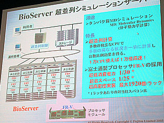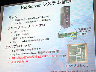今回開発した「バイオサーバー」は、CPUに富士通の組み込みプロセッサーである「FR-V」を採用しており、1ラックに最大1,920個搭載することが可能。これは、最大8命令を同時に実行できるVLIW(ベリーロングインストラクションワード)型プロセッサーで、浮動小数点演算でも4命令の同時実行が可能であり、1ワットという低消費電力で1.33ギガFLOPSのピーク性能を発揮する。CPU当たり256メガバイトのメモリーを積んでおり、OS(基本ソフト)としてはアックス(本社・京都市、竹岡尚三社長)が製品化した組み込み系Linuxである「axLinux」を採用している。