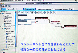今回のTurboWorxは、WindowsやLinux、UNIX、MacOS X、さらには各種のPCクラスターを含めた異機種混在型のコンピューター資源をムダなく活用することが可能。最大の特徴はワークフロー機能で、画面上でコンポーネントをつなぎ合わせていくだけで、一連の処理を全自動で実行させることができる。各コンポーネントには、コマンドラインから起動できるあらゆるプログラムを登録することが可能。コンポーネント間の連結には条件式を定義することもでき、複雑な処理手順を組み込むことも容易である。