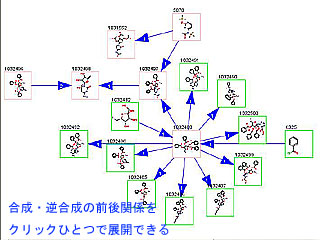 また、合成経路を探索するためのリアクションプランナーも直感的な操作が特徴。任意の化合物構造を中心として合成・逆合成の経路をネットワーク上に一覧表示する“リアクションリレー”機能を備えており、表示されている構造をクリックするだけでその先の合成ルートを展開することができる。関連する反応をだれでも簡単に引き出すことが可能である。さらに、目的物に至るすべての経路を網羅する“逆合成ツリー”機能により、新しい合成ルートを発見することも可能になる。検討結果をもとに、合成のための実際の手順書を作成・出力する機能も持っており、研究室全体の作業効率化にも寄与する。