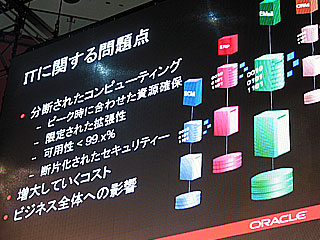 講演の冒頭で、チャールズ副社長は今日の情報システムの3つの課題を指摘した。「第1に断片化されたデータという問題がある。複数のアプリケーションがそれぞれ別々のサーバー上で稼働しているためだ。第2は、過去のいろいろな時代のソリューションが混在して複雑化しており、それを短時間で統合しなければならないという困難な問題を抱えているという点だ。情報がばらばらになっていると、情報の質は落ち、情報を普及させることも難しくなる。その結果、経営上の意思決定の質的低下を引き起こしてしまう。そして第3の課題がコストに対する圧力で、ユーザーは毎年情報コストを引き下げていきたいと願っている」と論じ、「すべての情報を1ヵ所に格納するのがオラクルの考え方である」と強調した。