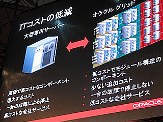 ここで、フィリップス副社長はOracle10gによるグリッドコンピューティングを解決策として示した。同社では、実用化が先行している科学技術分野のグリッドコンピューティングと区別するために、“エンタープライズグリッドコンピューティング”と呼称し、これを「1台の大きなコンピューターの役割をする小さなサーバーの統合利用である」と定義している。