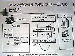 2004.01.17−アマノは、時刻認証・デジタルタイムスタンプサービス「EVIDENCE」(エビデンス)で、一般企業向けの事業展開を強化する。これは、電子文書の作成日時などを厳密に証明する技術で、その点での確実さが要求される官報(国立印刷局)などの特殊な分野で採用が進んできた。しかし、最近では企業内の機密情報が電子的に保存されることが増えており、そうした知的財産を保護する観点からもこのソリューションが有用だとして、対象を大幅に広げて提案活動を推進することにした。同社ではこれを次世代の主力事業に育てる方針。