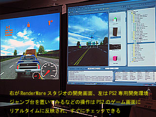 最大の特徴は、パソコン上で動作するRenderWareスタジオの開発環境が、各ゲーム機専用の開発環境とダイナミックにリンクしていること。例えば、レーシングゲームでコース上にジャンプ台や障害物などのオブジェクトを配置し、属性を設定したり、プログラムを埋め込んだりすると、プレイステーション2などの実際のゲーム画面ですぐにその挙動を確認することが可能。開発者は、簡単にプロトタイピングが行えるので、本来のゲームのおもしろさをデザインすることに注意を集中できるようになる。