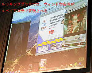 シュワルツ副社長は、「ただ、外観がWindowsに似ていることが面白くない」と茶目っけたっぷりに述べ、開発中の“プロジェクト・ルッキンググラス”を紹介、デモンストレーションを行った。これは、三次元化されたデスクトップで、どちらかというとMacOS Xに似ている。ウィンドウは映像などを表示させたまま三次元的に回転させることが可能で、複数のウィンドウを縦にして邪魔にならないように片付けておくこともできる。ウィンドウを裏返すと、そのウィンドウのプロパティ画面がくっついていたりする。まだまだ開発中の段階だというが、「デスクトップ環境からマイクロソフトを一掃したい」と冗談混じりながらも、最終目標をはっきりと示した。