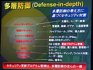 東氏によると、ぜい弱性に関する情報が公開されたあと、それを悪用した脅威が出現するまでの日数がだんだん短くなってきているという。例えば、「Nimda」の登場がぜい弱性情報公開から331日後だったのに対し、「SQL Slammer」では180日、「Welchia/Nachi」では151日、「Blaster」にいたってはわずか25日だった。しかも、Blasterの場合は感染したPCが外部から持ち込まれたり、リモート接続されたりして、社内のLANにつながった途端に感染が広がるなど、ファイアーウォールを中心とした従来型の防御手段では防ぐことができなかったとして、多層防御の考え方を採用するよう訴えた。
