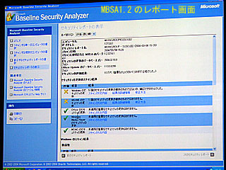 最初のツールは「マイクロソフト・ベースラインセキュリティアナライザー」(MBSA1.2)で、ネットワーク上のPCのパッチ適用状況を自動的に調査し、レポートする機能を持っている。ドメイン名やIPアドレスの範囲で一括指定でき、一度に調べられるPCの数に制限はない。Windowsの2003、2000、XP、NT4.0のほか、IIS、SQLサーバー、オフィス、インターネットエクスプローラーなど幅広いマイクロソフト製品に対応しており、どのマシンにどのパッチが当たっていないかをひと目で把握できる。あるユーザーのパスワードが危険だなどの判定も行ってくれる。コマンドラインから使用することも可能で、同社のサイト(http://www.microsoft.com/japan/security/home/tool/mbsa1.mspx)から無償でダウンロードして利用できる。