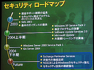 最後に、古川氏はBlasterで学んだ経験に触れ、「感染したPCが持ち込まれることに対しては、Windowsサーバー2003のSP1で検疫機能を提供する。安全なPCだけをネットワークに接続させ、感染したPCはただちに発見・隔離される。このSP1は今年の下半期に開発完了の予定だ」とした。さらに、将来に向けたプロジェクトとして推進中のNGSCB(ネクストジェネレーション・セキュアコンピューティングベース)についてもわずかに言及し、「CPUとメモリー間の通信を保護する機能などを開発している」と紹介した。
