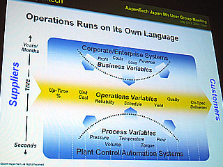 つまり、プラントのオペレーション領域におけるシステム統合化が重要だというのがマッキリン社長の意見。「プラント内の温度・圧力・流量などの情報は1980年代に登場したDCS(分散型制御システム)によって制御・自動化されるようになり、売り上げ・コスト・収益などの企業情報は1990年代に登場したERP(エンタープライズリソースプランニング)によって活用が図られ、ビジネスの変化に柔軟に対応できるようになった。