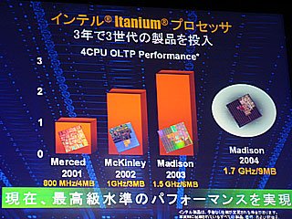 また、マルホトラ事業部長はアイテニアムファミリーの変遷について触れ、「2001年の“Merced”(コード名マーセド、800MHz/4MB)、2002年の“McKinley”(同マッキンレー、1GHz/3MB)、2003年の“Madison”(同マディソン、1.5GHz/6MB)と、3年間で3世代の製品を投入し、ムーアの法則を超えるペースで性能向上を達成してきた」とし、次期プロセッサーのロードマップを明らかにした。