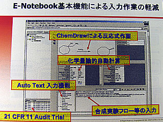 電子ノート自体は新しいものではないが、手で書いた方が速いなどの実態があってなかなか普及しなかった。そこで、CS社のEノートブックは入力のしやすさを徹底的に追求。テンプレート機能、モル数や質量などの自動化学量計算、オートテキストなどの入力支援機能を搭載しており、手書きよりも高速な入力を実現した。使いなれたワードやエクセルをそのままノート内に統合できるという特徴もある。検索機能も強力で、構造式を利用できるほか、ワードやエクセルの中身まで全文検索の対象にすることができる。