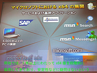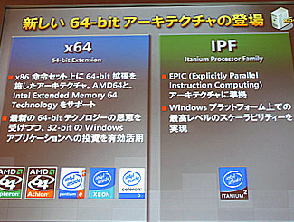 64ビット版のWindowsサーバー2003は、すでに出荷済のIPF(アイテニアム・プロセッサーファミリー)版と今回のx64版を合わせて2種類になるが、それぞれアプリケーションの互換性はなく、IPF版のソフトをx64上で動かすためには再コンパイルが必要。米マイクロソフトのウィンドウズサーバー開発担当ゼネラルマネジャーのクリス・フィリップス氏は、「4ウェイ/8ウェイ以上のスケールアップ型アプリケーションを利用するユーザーにはIPF版を、スケールアップの必要がないメインストリーム型のアプリケーションユーザーに対してはx64版をすすめたい」とした。いずれにしても、2006年末には64ビットではないサーバーは市場からほとんど姿を消しているだろうとの見通しを示した。32ビットから64ビットへの移行はかなり急速に進む可能性があるようだ。
