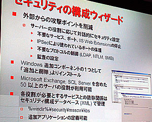 Windowsサーバー2003は、同社の“Trustworthy Computing”(信頼のおけるコンピューティング)に基づいたSD3+C(Secure by Design、Secure by Default、Secure by Deployment、Communications)思想に基づいて開発されたOS(基本ソフト)で、Windows2000サーバーのときは発売後18ヵ月後までに発見されたぜい弱性の数が62個だったのに対し、Windowsサーバー2003ではそれが24個に抑えられている。しかし、それでもぜい弱性は次々に発見されており、ウイルス発生までの時間も大幅に短縮化、攻撃方法も巧妙化するなど、セキュリティの脅威はますます高まっているのが現状。