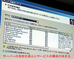 セキュリティの構成ウィザードは、セキュリティポリシーを作成し、セキュアな設定を簡単に実行するための管理ツールで、ウィザードに従って対話的に操作していくだけでふさわしい設定が完了する。ネットワーク上のサーバーに遠隔から適用することも可能。このウィザードでは、最初にサーバーの役割を選択する。すでにインストールされているサーバーの役割がリスト表示されるので、その中から利用したい機能を選択。さらにそのサーバーが実行するクライアント機能をやはりリストの中から選び、管理に利用するオプションを選択すると、そのセキュリティポリシーの設定によって変化するサービスの構成が一覧表示されるので、それを確認してOKするだけ。ウィザードはこのあとに、ポートの設定とそれを利用するアプリケーションの承認、レジストリーの設定、監査ポリシーの設定−と続くが、最初にサーバーの役割と管理オプションを選んだあとは、ほぼデフォルトのままでかまわないということだ。
