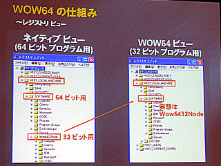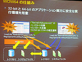 32ビットアプリケーションはOS上のエミュレーションレイヤーである“Windows32 on Windows64”(WOW64)を介して動作する。このサブシステムは、プロセスの起動時ではなく、OSの起動時に自動的にロードされる。具体的には、32ビットアプリケーションからシステムコールが発せられると、WOW64がそれをインターセプトして、64ビットシステムファイルを利用できるようにする。32ビット環境と64ビット環境をうまく混在させるため、レジストリーやファイルシステムをリダイレクトする仕組みが組み込まれている。