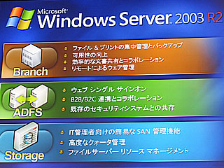 ステージ上では、続いてのデモでWindowsサーバー2003 R2の新機能の1つであるADFS(アクティブディレクトリーフェデレーションサービス)が紹介された。これは、B2BやB2Cのコラボレーションを安全かつ簡便に実現するための機能。通常、外部のパートナーなどに特定のアプリケーションへのログインを許す場合は、IDとパスワードを使って認証を行う。しかし、ADFSでは双方に設置されたフェデレーションサーバー同士が信頼関係を確立するので、利用者はパスワード入力の手間から解放される。