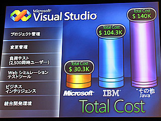 ビジュアルスタジオ2005も、開発環境としては8,200ドルであり、IBMやその他のJava系ベンダーが採用しているオープンソースのEclipseが無料であることに比べれば高いが、ビジネスインテリジェンスやウェブシミュレーションテストツール、2,500同時ユーザーの負荷テスト、変更管理、プロジェクト管理を加えると、トータルコストではビジュアルスタジオの3万300ドルに対して、IBMが10万4,300ドル、その他のJavaベンダーは14万ドルと大きな差が出るという。