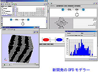 今回のJ-OCTA 1.1では、ユーザーの要望をタイムリーに反映させた機能強化を実施した。とくに、粗視化分子動力学法エンジン「COGNAC」に導入された散逸粒子動力学法(DPD)をグラフィカルに使いこなすための専用モデラーが追加されている。DPDは、やはりJ-OCTAに含まれている動的平均場法エンジン「SUSHI」と同様に高分子のモルフォロジー予測を行うことができる。SUSHIの方は系を濃度場として記述する手法であり、高分子がつくるモルフォロジーの界面部分の濃度分布などを求めることができる。これに対して、DPDは分子構造を粗視化して扱うCOGNAC上で動作するため、例えば分子構造中の親水基が水の方向を向いているかどうかなど、分子の立体構造を考慮したモルフォロジー解析ができる点が最大の特徴。