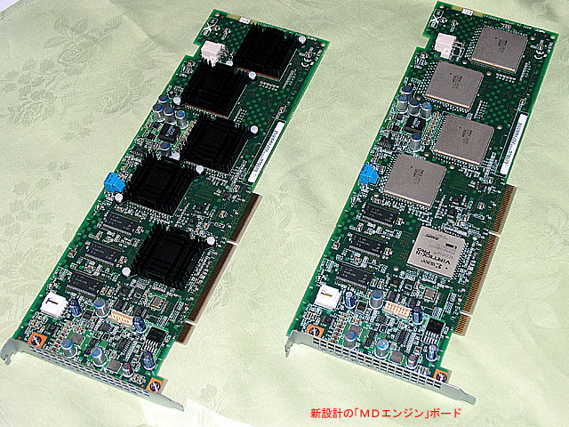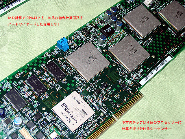 MDエンジン1枚には、専用LSIとしてのプロセッサーが4個搭載されている。MD計算の99%以上を占めるクーロン力や分子間力などの非結合計算を行う回路がハードウエアとして実装されており、圧倒的な高速性能を引き出したことが特徴。基本的な技術は昨年7月(正式発表は10月)に富士ゼロックスから導入したものだが、今回の製品化に当たっては4プロセッサーを制御するシーケンサーの実装やメモリーアクセス機構の改良など、コンピューターメーカーとしてのNECの独自ノウハウが盛り込まれている。