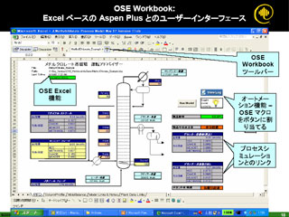 OSEワークブックは、プロセスモデルをエクセルとプロセスシミュレーターの間でいわば共有化させる機能を持つ。エクセルの背後でシミュレーターが自動的に動作するので、利用者にはシミュレーターの知識は不要。また、エンジニア側もVBA(ビジュアルベーシックオートメーション)などのマイクロソフトの開発ツールを知らなくても、エクセルにプロセスモデルを組み込むことができる。