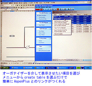 さて、実際にシミュレーターをエクセルと統合するためには、「OSEワークブックオーガナイザー」と呼ばれるツールを仲介役として使用する。オーガナイザーの機能がエクセルのツールバーに組み込まれるので、そこからAspenPlusのモデルを呼び出し、ワークシートに表示させたい変数を選んでコピー&ペーストする。そして、ワークシートの任意の位置でテーブル作成モードに入り、実際に表示させたい項目を選んだりカラムの順番を入れ替えたりしたあと、最終的にOKボタンを押すだけ。AspenPlusの入力データにリンクしたセルと計算結果を出力させるセルなどを色分けしたり、項目名をわかりやすく日本語に変えたりするのは、すべてエクセルの通常の操作として簡単に行える。オーガナイザーが仲立ちするため、ソフトがバージョンアップしてもワークシートをつくり直す必要はない。