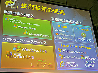 そのほか、会見中のダレン・ヒューストン日本法人社長のプレゼンテーションの中で、日本市場に対して基幹業務アプリケーションを投入する計画が正式に示された。「Microsoft Dynamics」(マイクロソフトダイナミクス)と呼ばれている製品で、来年前半にまずはCRM(カスタマーリレーションシップマネジメント)、来年中にERP(エンタープライズリソースプランニング)パッケージを発売する予定。
