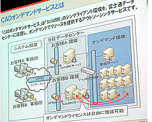 SolidMXは、自社開発の二次元/三次元CADで、1,900社/2万シートの導入実績を持つ。昨年6月にイントラネットサーバー集約型のシンクライアント対応版を開発しており、今回はこれをオンデマンド環境で利用できるようにした。設計業務は、特定の期間に業務が集中し、一時的に大量の資源を消費する傾向があることから、第1弾のサービス分野にふさわしいと判断したという。