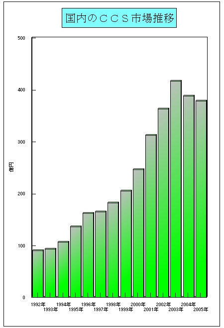 CCSnewsでは、毎回のCCS特集に合わせて、主要ベンダー各社の売り上げの推移をもとにしたCCS市場動向を調べている。それによると、2005年度の国内CCS市場規模は約380億円で、前年度に対し2−3%の減少だったとみられる。