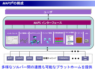 MAPSは、分子モデリングや計算結果の解析・可視化などのGUI(グラフィカルユーザーインターフェース)環境と、各種ソルバーとのインターフェースを備えた材料設計支援のためのプラットホーム。