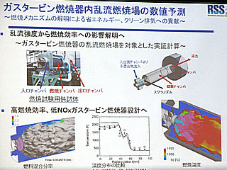 ソフトはFSISから引き継がれて、すでに実証段階に入っており、毎分4万回転という高速で回転するポリゴンミラー(スキャナー部品)や産業用ポンプの騒音解析を行った事例がある。これらのケースでは、音が伝わる媒体が空気や液体、さらには構造体自体を伝播するなど複合的に組み合わされるため、解析が非常に難しいケースになるという。また、瞬間的な乱流現象がともなう問題として、ロケットエンジンのターボ機械内部の非定常流れの解析、フォーミュラーカー走行時の空気流動特性の解析なども行われている。これらは具体的な共同プロジェクトとして実施されており、シミュレーションが実用域に入っていることを示している。燃焼の問題では、三菱重工との共同研究により、ガスタービン内部の乱流強度と燃焼効率の影響を解析し、高効率燃焼による低NOx燃焼器の設計に取り組んだ事例があるという。