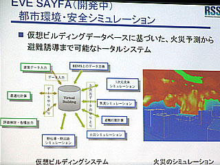 最後は都市環境・安全シミュレーターのEVE SAYFAで、これもRSS21からの新規ソフトになる。とくに、火災への対策を主眼としたもので、欧米での研究例が限定的な現象の解析にとどまっているのに対し、人命を保護することを目的としたトータルシミュレーションを目指していることが特徴になる。仮想ビルディングデータベースシステムが中心に据えられており、瞬時瞬時のビルの状態・火災の状況・人の位置などをフィードバックしつつ解析を行うことができる。建造物の防災設計の信頼性を大幅に高めることができる。