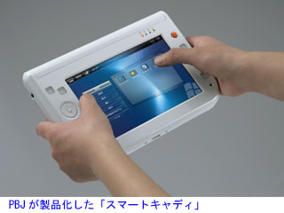 一方、PBJが開発した製品は「スマートキャディ」という名称で、価格は9万9,800円。CPUにVIAのC7-M(1GHz)、ビデオ機能にVIA VN800内蔵「ユニクロームプロ」グラフィックスを採用。512MBのメモリーと40GBハードディスクを内蔵している。本体サイズは228×146×25.1ミリメートルで、重さは約880グラム。4日からエキサイト、ソースネクスト、ノジマのウェブショップで予約受付を開始した。出荷は14日からの予定で、それ以降はノジマの店頭でも販売する。その他、ビジネス向けでは特定分野にノウハウを持つエスアイエス、日本テクト、日立情報システムズ、菱洋エレクトロなどと代理店契約を結んだ。初年度10万台の販売を見込んでいる